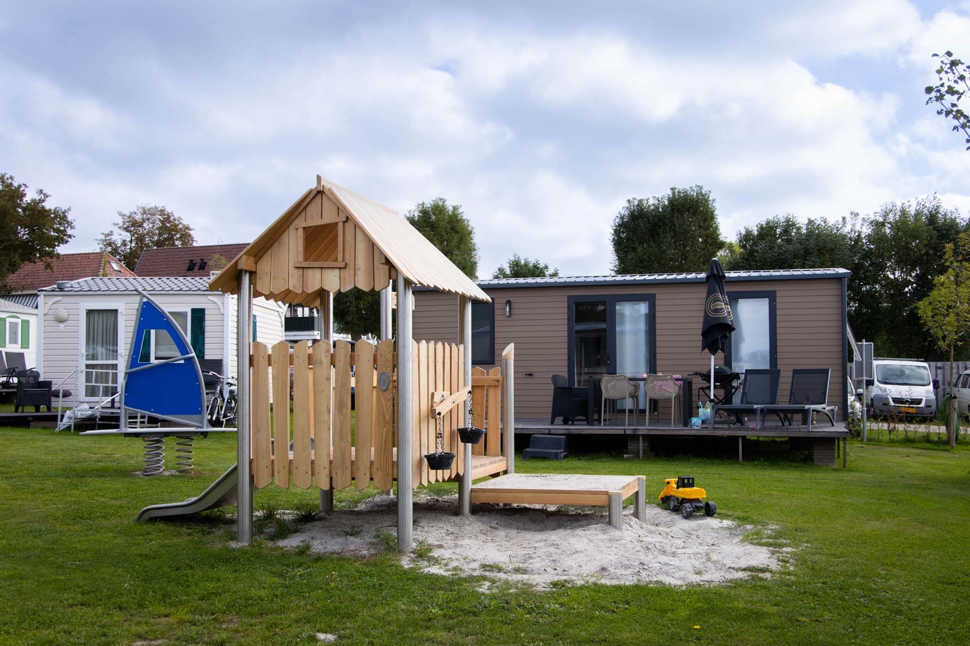 Entdecken Sie die Wadden Lodge Komfort, ein modernes Chalet für 4 Personen auf unserem Campingplatz in Nordholland. Draußen erwartet Sie eine große Terrasse, perfekt für ein Frühstück in der Sonne oder um abends mit einem Getränk zu entspannen. Die Lodge liegt mitten in der Natur, in der Nähe des Lutjestrands und dem Wattenmeer und ist ideal für Familien oder Freunde, die Ruhe, Raum und Komfort genießen möchten.