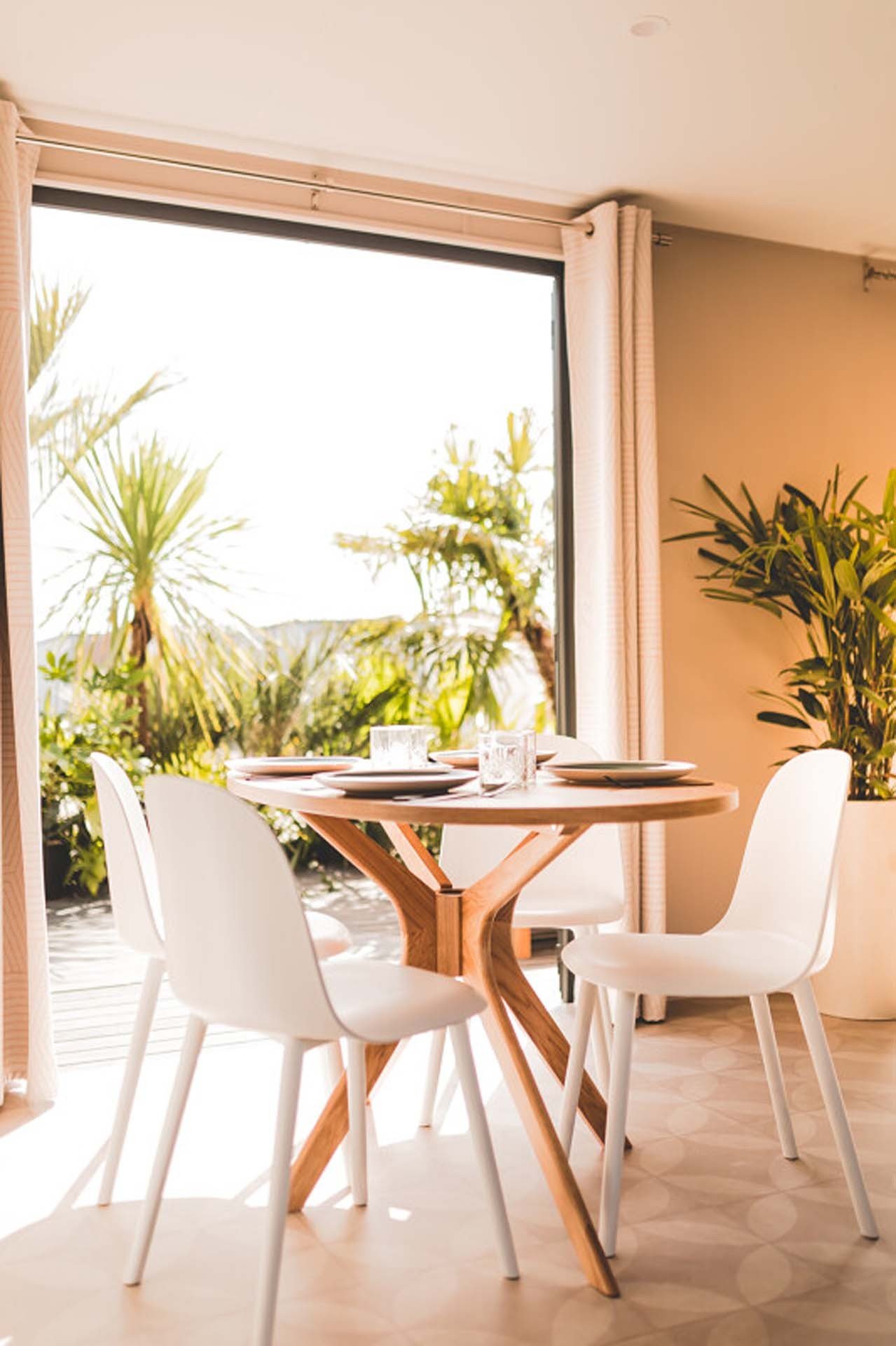 • Terrassentüren zu einer großen Terrasse mit Liegestühlen und Sonnenschirm